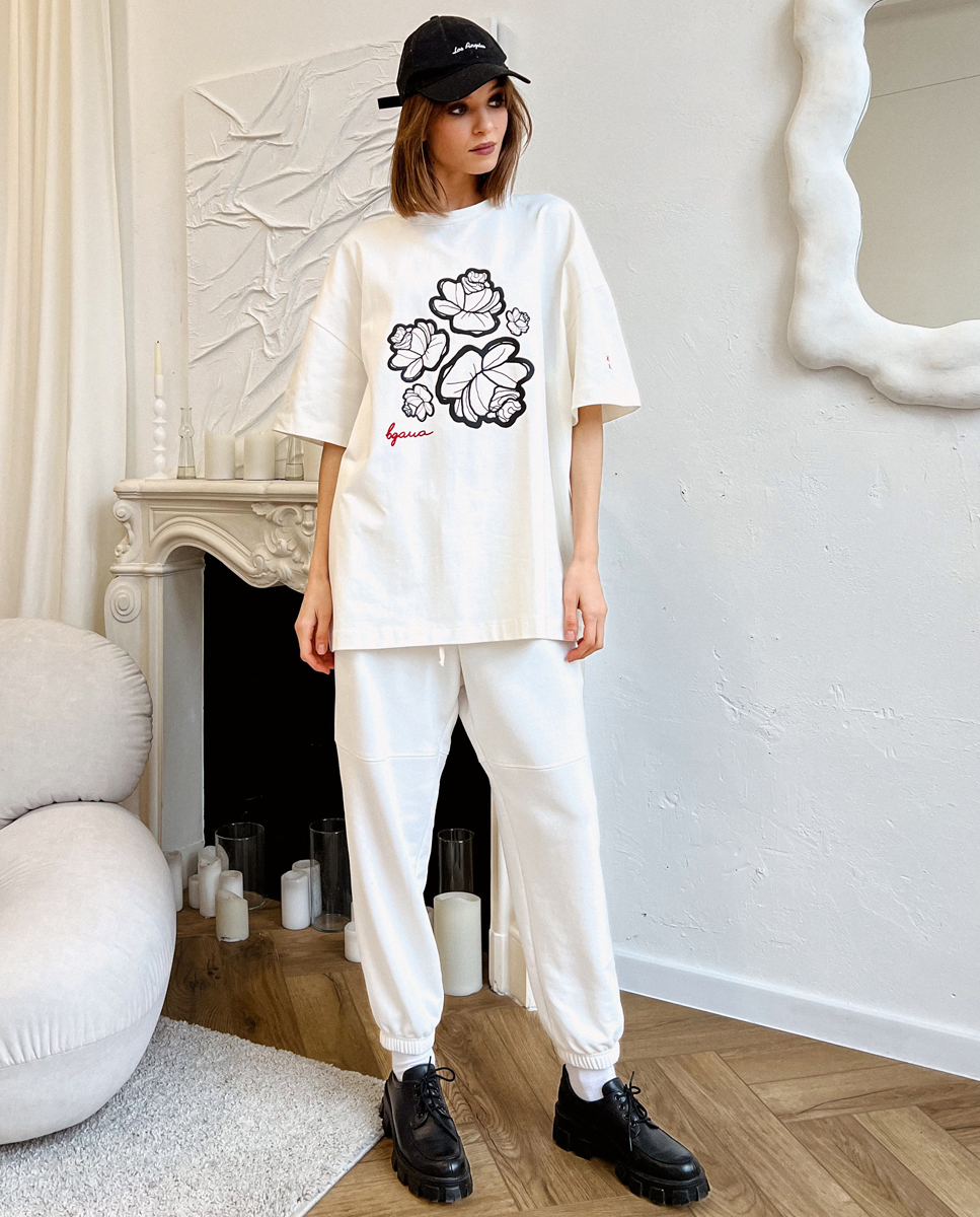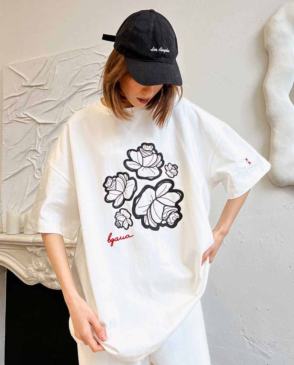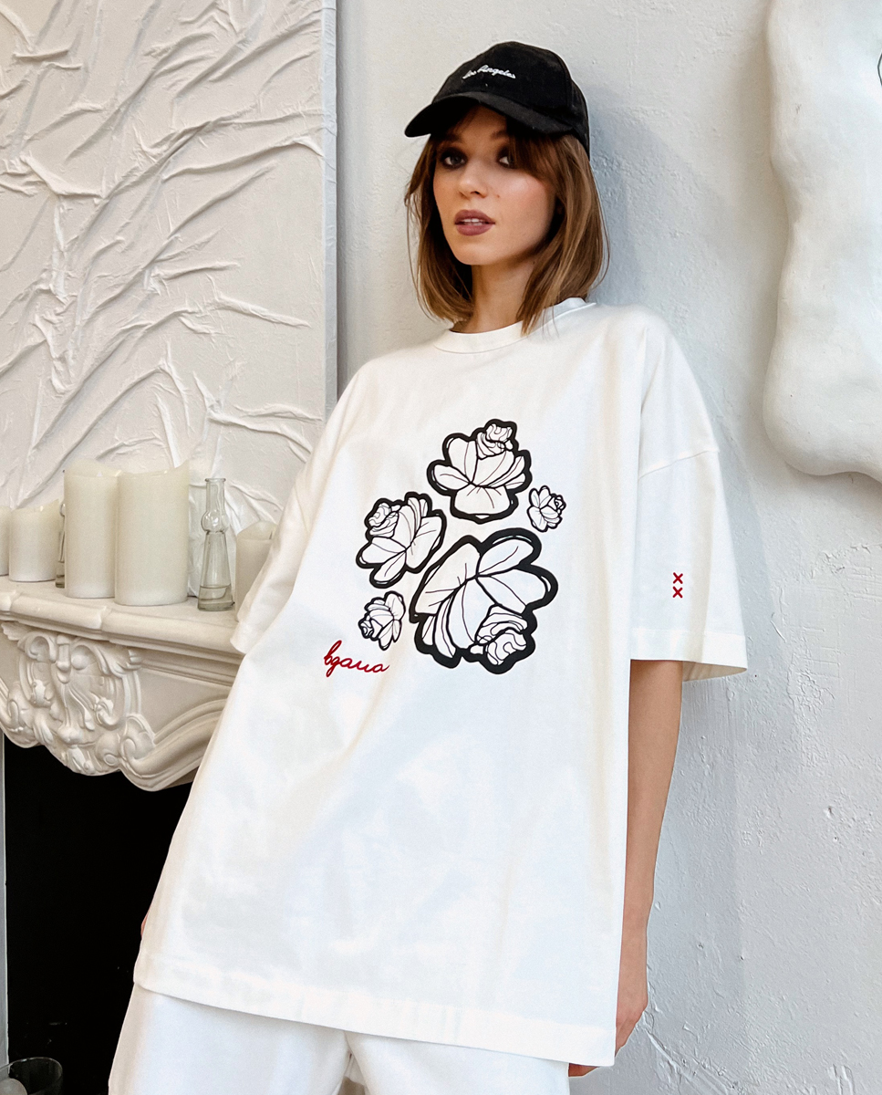 Футболка в молочному кольорі зі щільної бавовни, яка класно тримає форму, з принтом квітів та надписом “вдома”.