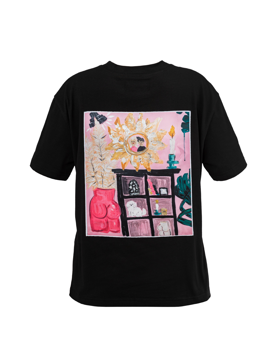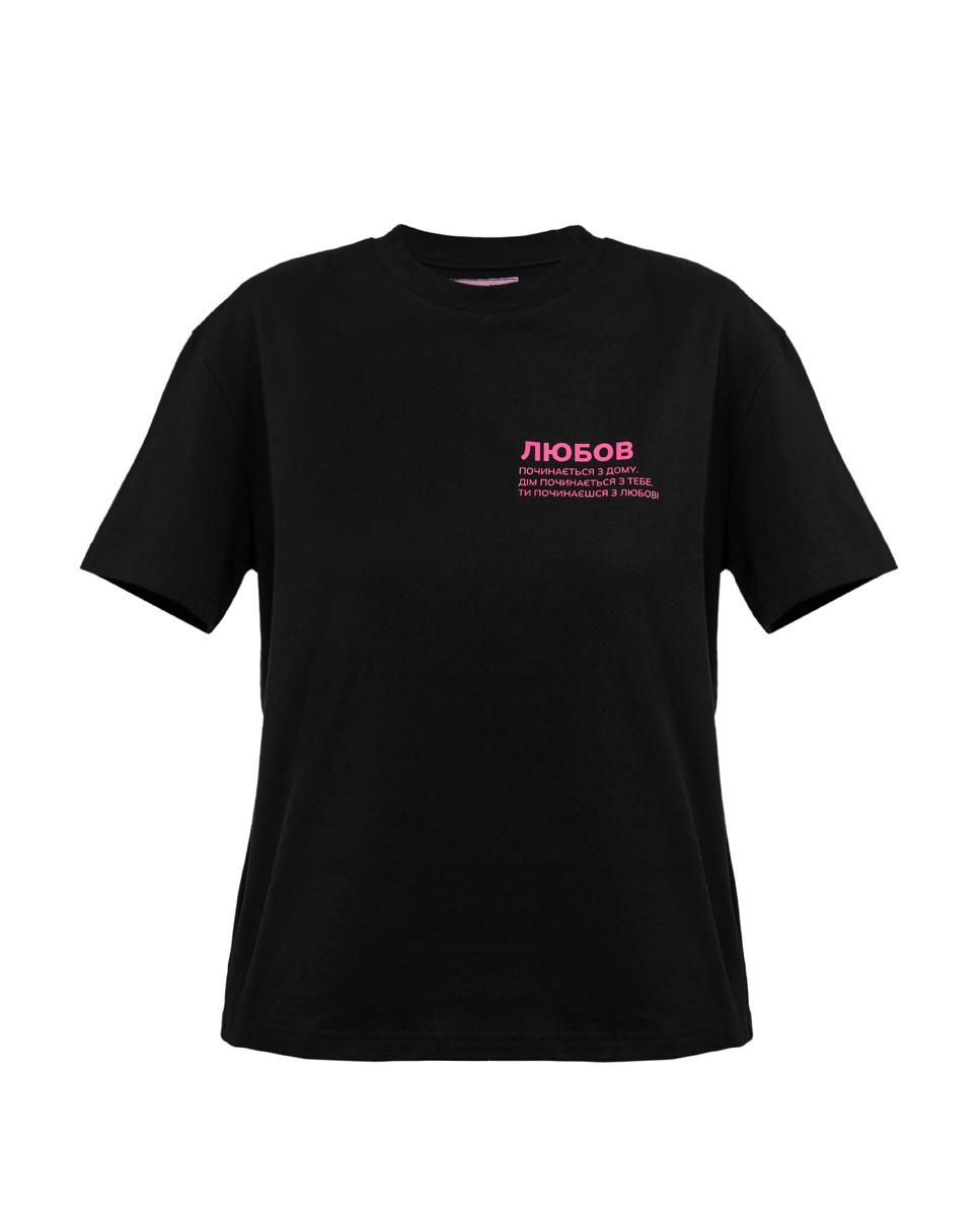 Базова футболка чорного кольору. Родзинкою моделі виступає яскравий принт на всю спину – малюнок квартири в рожевих відтінках та напис такого ж кольору на грудях «Любов починається з дому. Дім починається з тебе. Ти починаєшся з любові».