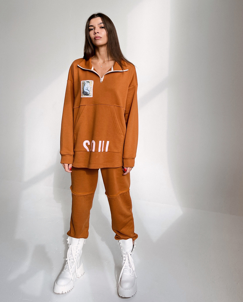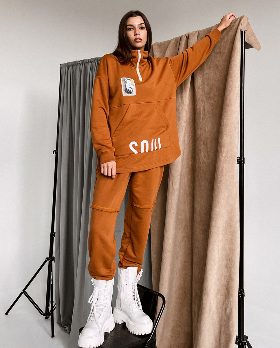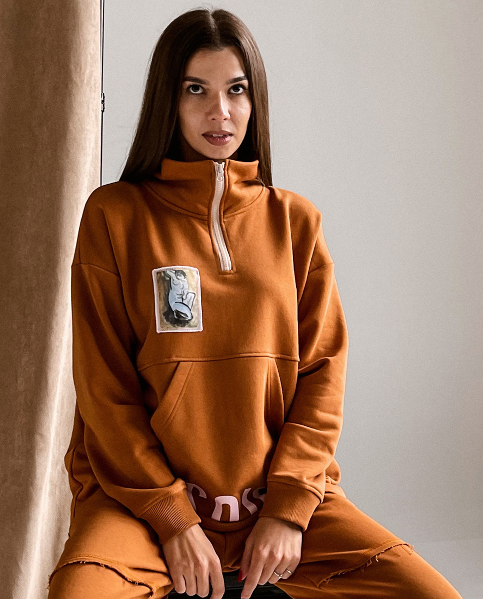 Олімпійка з напівприхованим надписом «Душа», контрастною змійкою на високій горловині та невеличким принтом на грудях за мотивами картини Матісса.