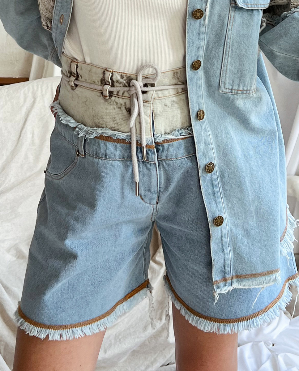 Шорти з високою посадкою, що підкреслює талію. Виконані з двох видів джинсу. Імітація подвійного поясу та відкриті шви з бахромою роблять їх цікавим та незвичним елементом гардеробу.