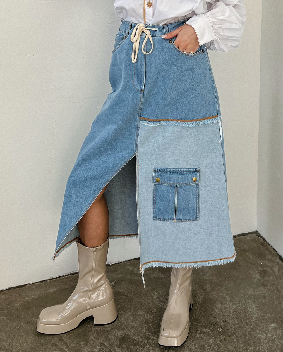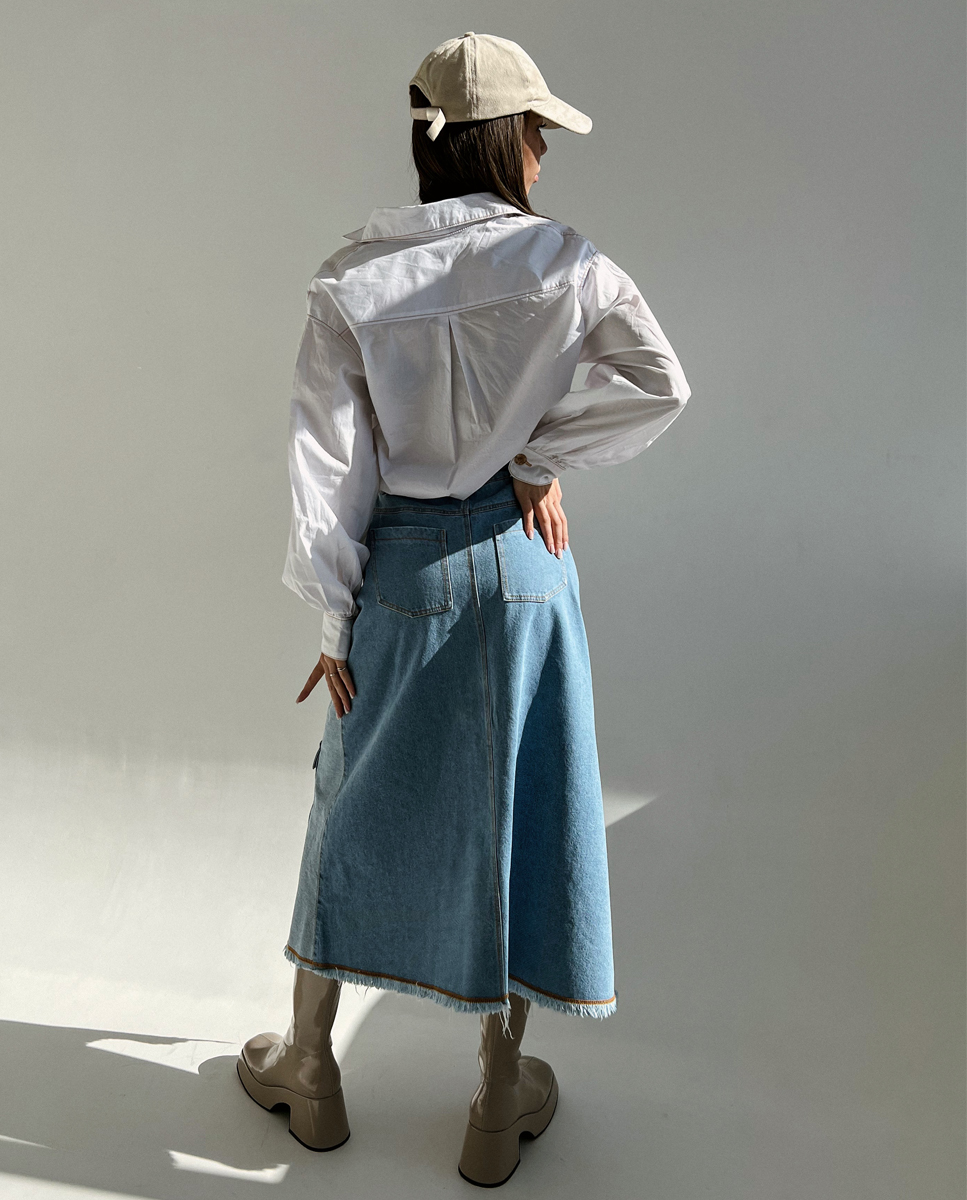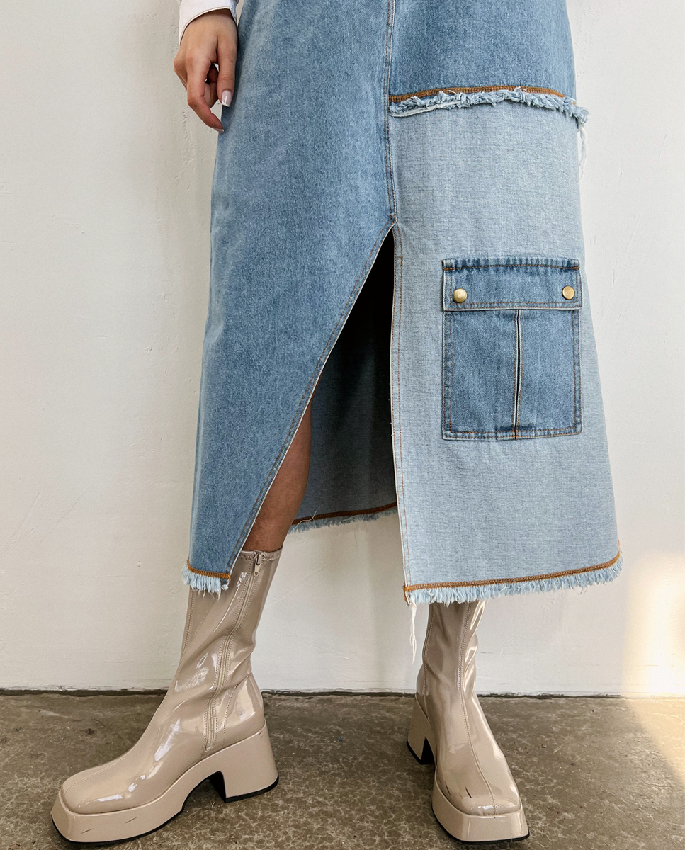 Топова спідниця в довжині міді незвичного крою з поєднання двох відтінків джинсу. Необроблені краї з бахромою, контрастні строчки, накладна кишеня. Це спідниця, яку можна носити весь рік.