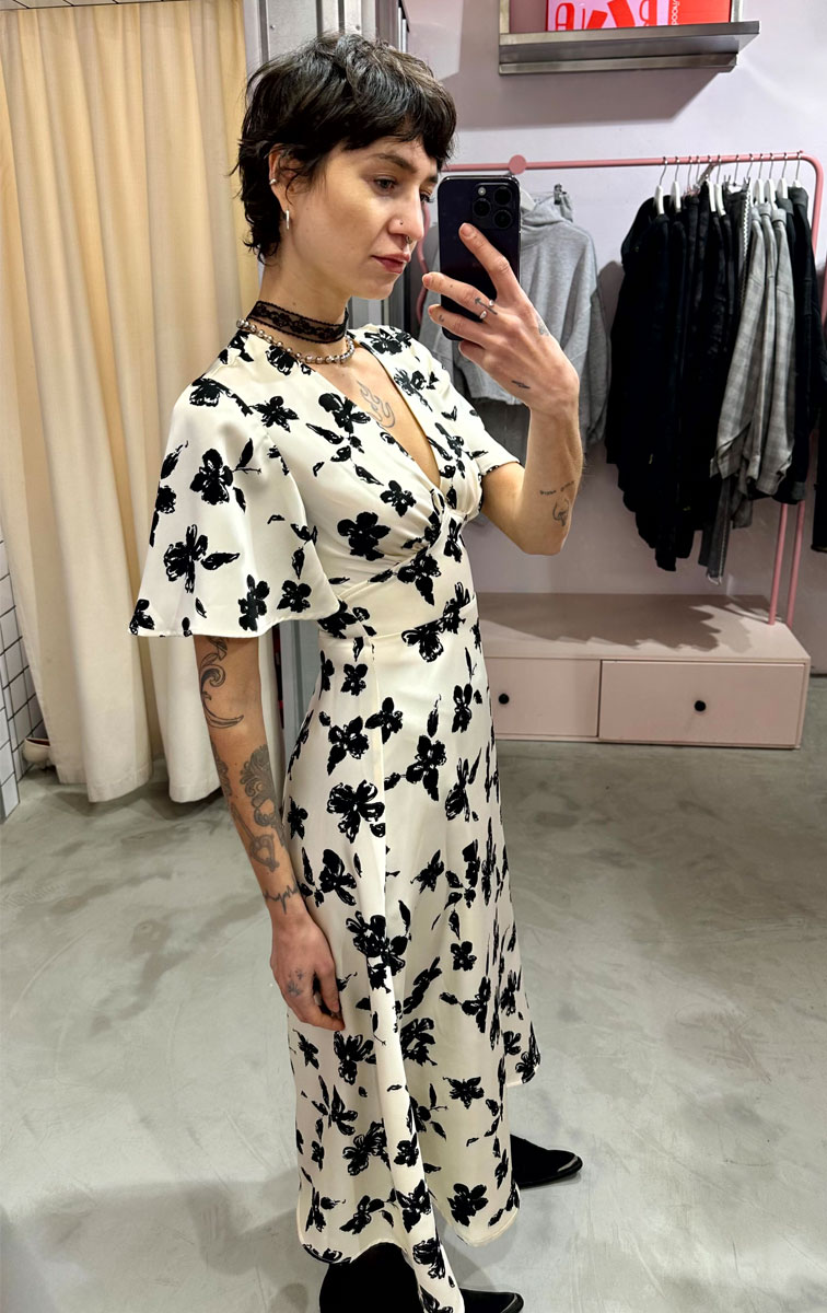 Вишукана велюрова чорна сукня-олімпійка довжини міні. Жата резинка вигідно підкреслює лінію талії, атласні білі стрічки, V-подібно розташовані – створюють цікавий силует і підкреслюють зону декольте. Вишитий напис «Bonjour mademoiselle» на спині доповнює образ.