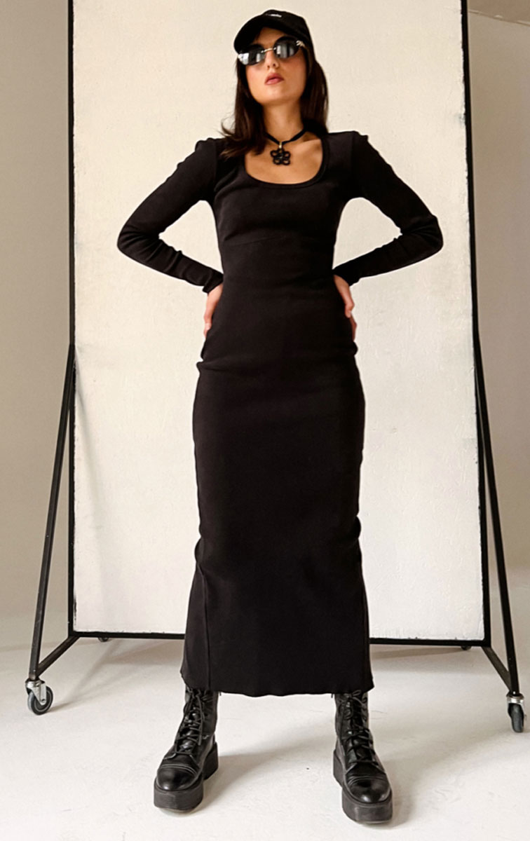 Стильна чорна сукня в рубчик довжини міді. П-подібний виріз спереду в поєднанні з вирізом на спинці підкреслять всі переваги твоєї фігури.
