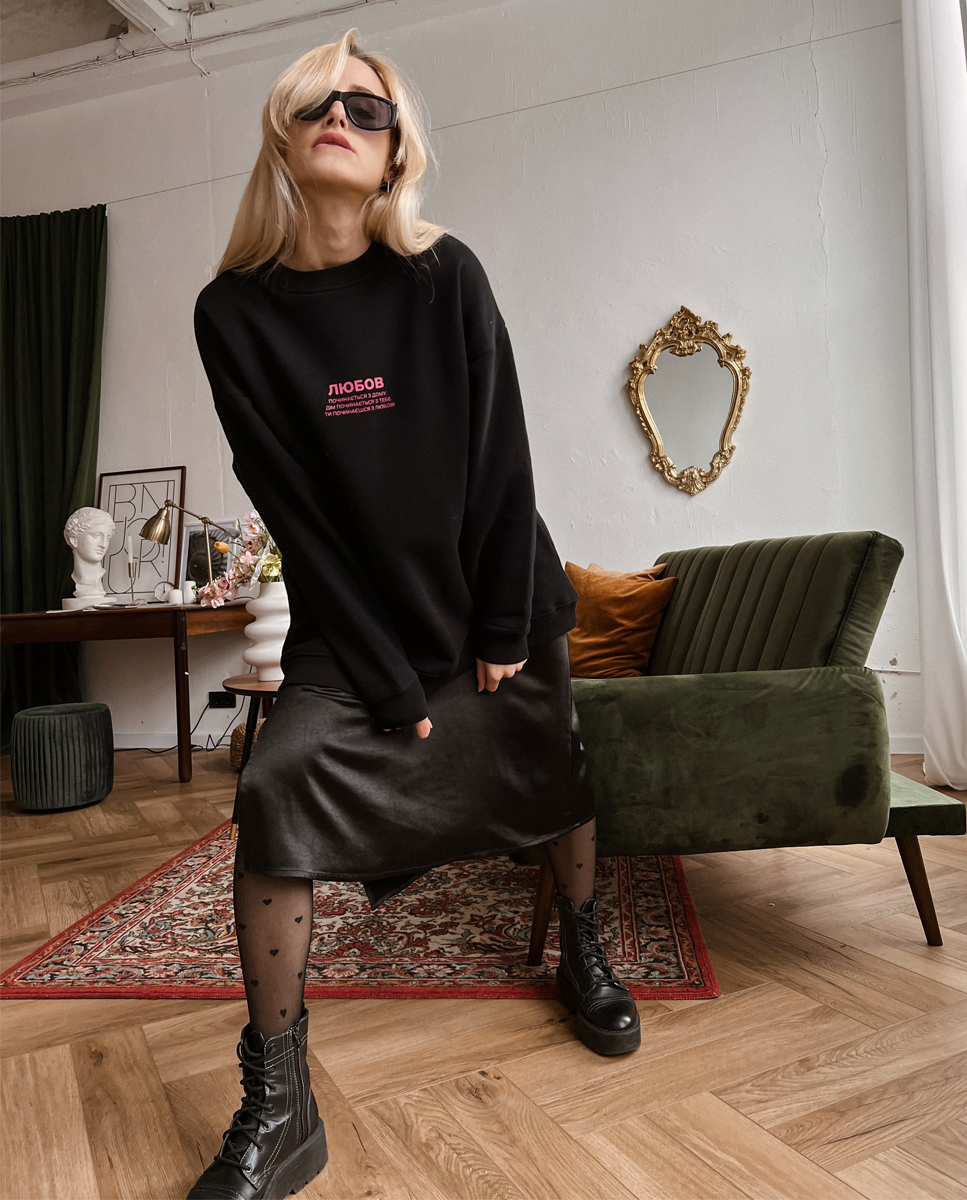 Базовий утеплений oversize світшот в чорному кольорі. Невеликий, але душевний напис на грудях «Любов починається з дому. Дім починається з тебе. Ти починаєшся з любові» доповнюється стильним великим принтом на спині.